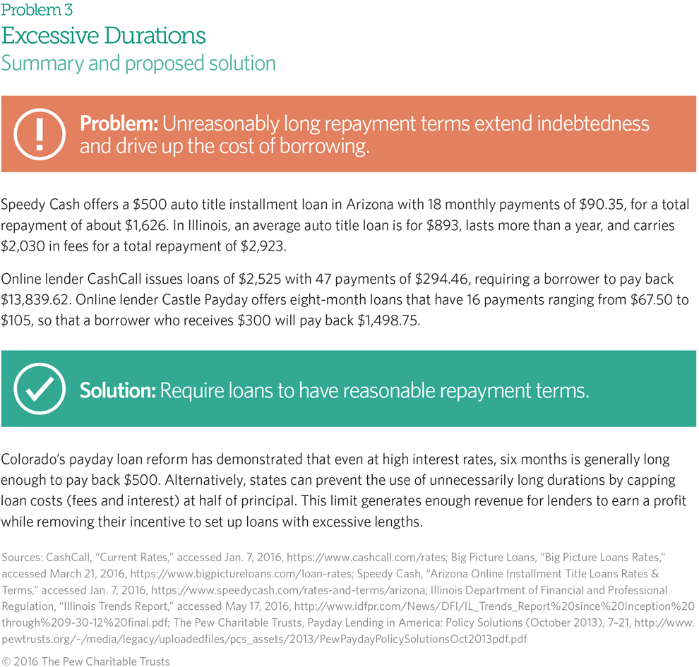 Discouraging excessive loan terms will become important as longer-term installment loans become the norm. The final CFPB rule for payday and similar loans will need to include clear guidelines for appropriate loan durations. States that modify their existing payday or installment loan statutes should also put policies in place that discourage excessive lengths. The CFPB’s proposed guidelines for certain longer-term alternative loans require terms between 45 days and six months.29 This range is consistent with Pew’s findings about the time borrowers need to repay loans affordably, with public opinion about reasonable durations for a $500 loan, and with the small-dollar loan programs established by the Federal Deposit Insurance Corp., National Credit Union Administration, and National Federation of Community Development Credit Unions, which give borrowers several months to repay.30