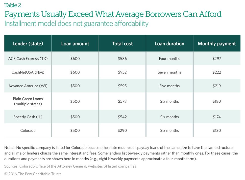 Research by The Pew Charitable Trusts and others has shown that the conventional payday loan model is unaffordable for most borrowers, leads to repeat borrowing, and promotes indebtedness that is far longer than advertised.3 To address these problems, the Consumer Financial Protection Bureau (CFPB) in June 2016 proposed a rule for regulating the payday and auto title loan market by requiring most small loans to be repayable in installments. In Colorado, a structure requiring that loans be payable over time—combined with lower price limits—was shown to reduce harm to consumers compared with lump-sum loans, after that state passed legislation in 2010 requiring all payday loans to become six-month installment loans.4
