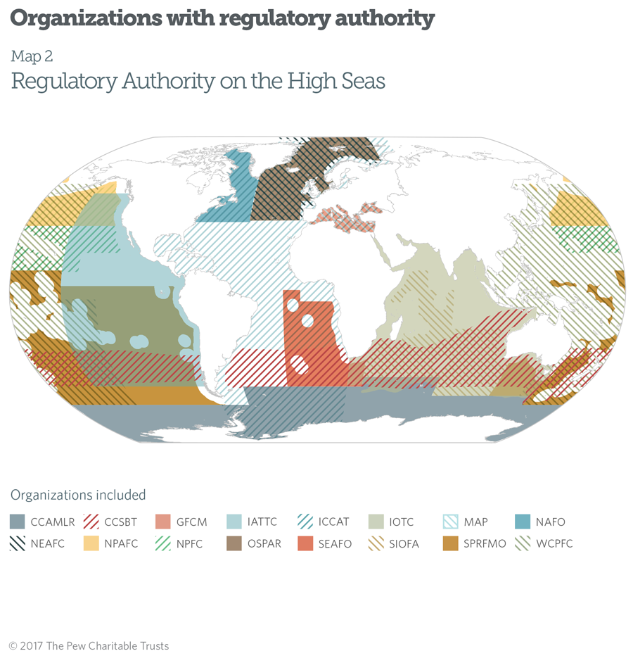 Most organizations with a mandate that extends to areas beyond national jurisdiction (ABNJ) do have regulatory authority, or the ability to create binding management measures. However, the vast majority of these organizations are limited to fisheries management. Organizations illustrated in Map 2 have regulatory authority, thereby excluding the Secretariat of the Pacific Regional Environment Programme.