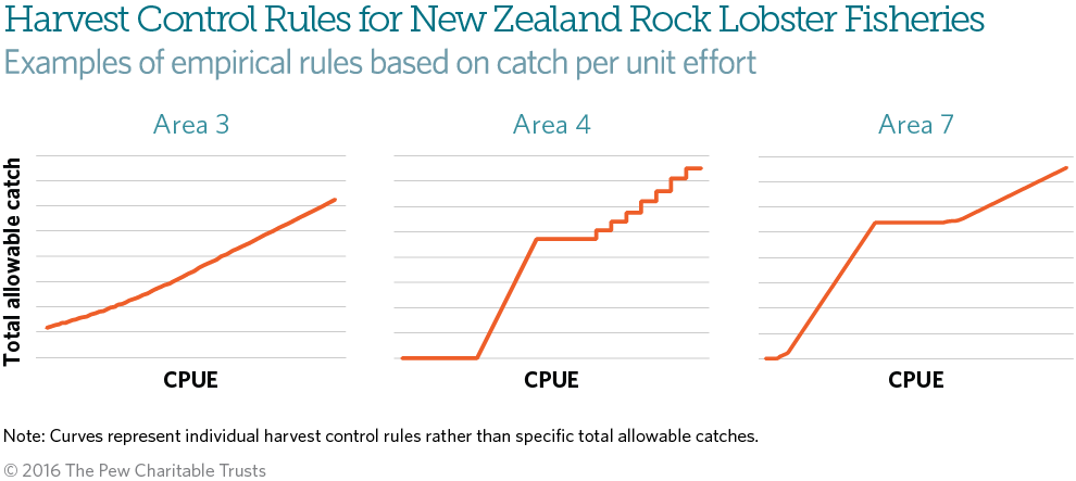 As applied to rock lobster, the target is BMSY, or a historical stock size proxy from when the stock had “good productivity and was demonstrably safe” (BREF). BREF is always at or above BMSY. The soft limit is defined as 20 percent of unfished SSB or 50 percent of BREF proxy, whichever is greater, while the hard limit is defined as 10 percent of unfished SSB or 25 percent of BREF proxy, again whichever is greater. Including the BREF proxies is a good practice because it can make the limits more conservative than the defaults. The MPs for each of the five lobster fisheries reflect their unique circumstances. Commercial quotas are set annually based on CPUE levels, but each HCR is slightly different from the others.