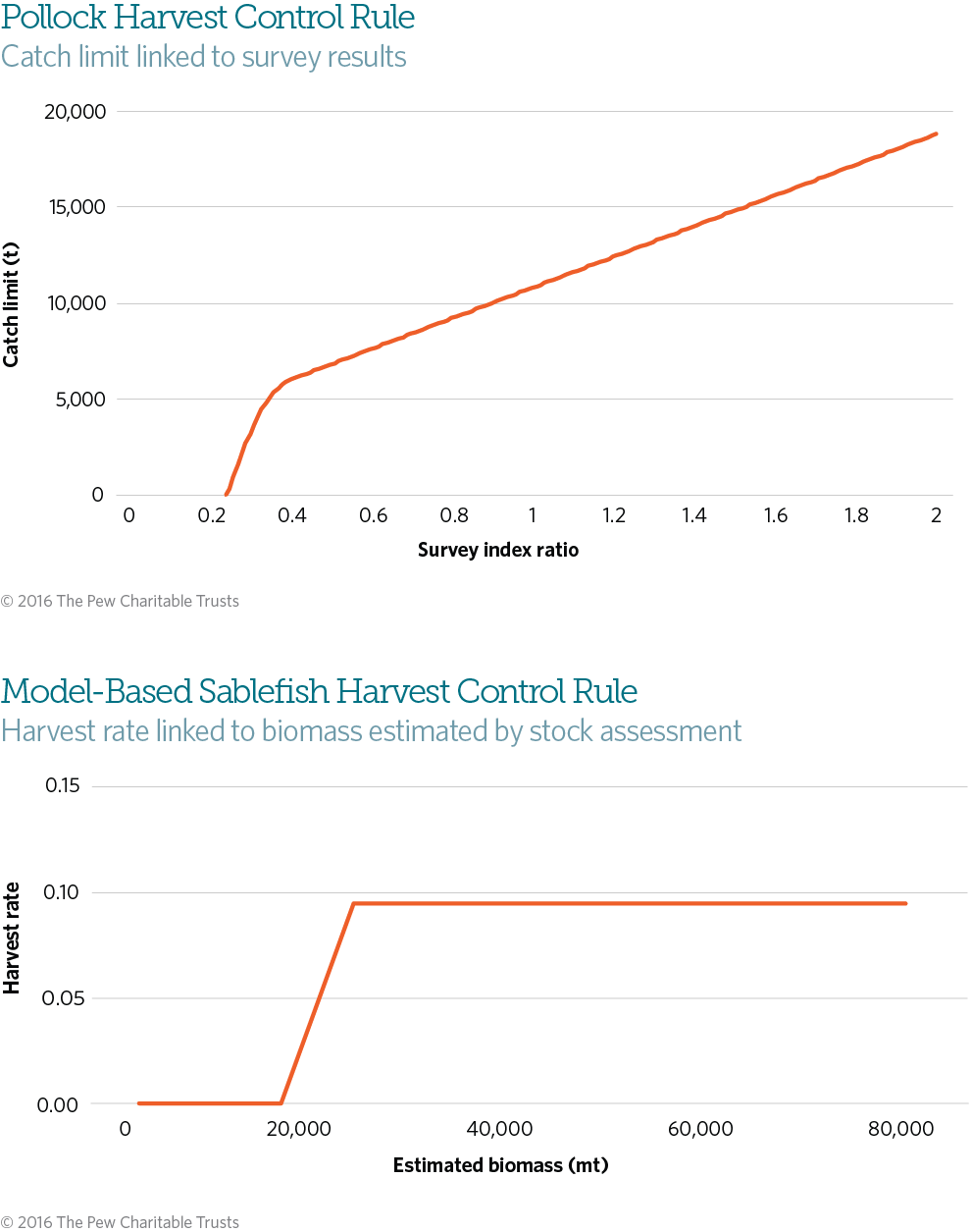 The pollock harvest strategy includes an empirical HCR, with quotas based on the three most recent years of a research survey of stock abundance, as long as no “exceptional circumstances” are observed.