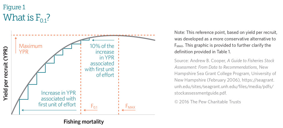 Other FMSYproxies include F0.1, half of the natural mortality rate (50%M), and FMAX, though the latter oftenoverestimates FMSYso it can be risky. For example, F0.1is used by scientists at the International Commission for theConservation of Atlantic Tunas (ICCAT) as the FMSYproxy reference point for the eastern stock of Atlantic bluefintuna. An analysis of candidate reference points for this stock found that F0.1was the best proxy for FMSY, while F40%was also robust.19F30%and FMAXwere more biased and less precise, however, so were not deemed by the ICCATscientists to be suitable proxies.