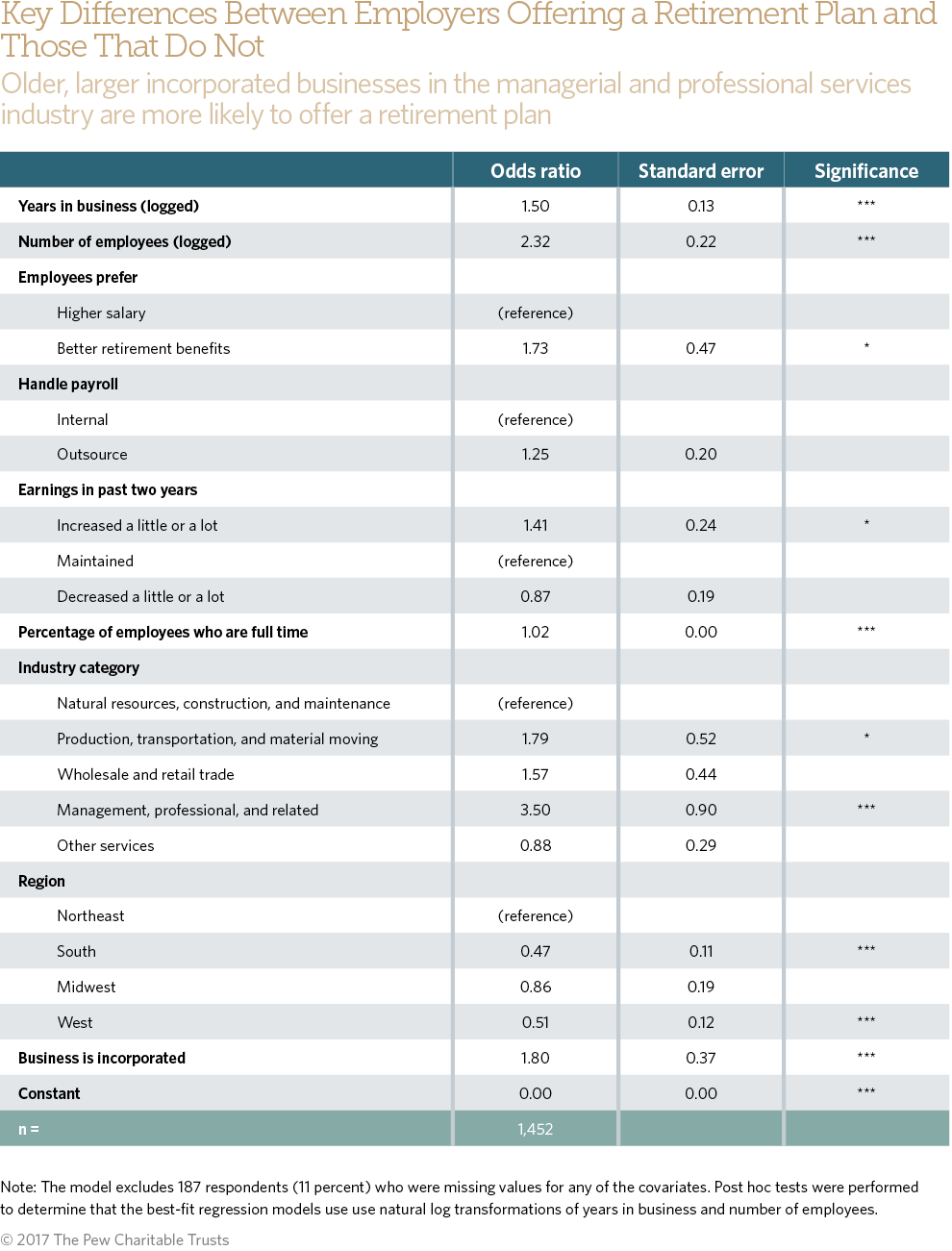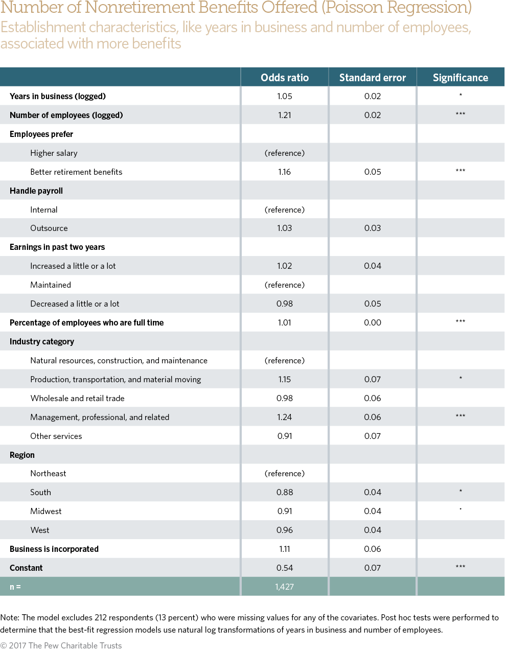 We use logistic regression to examine two dichotomous variables: 1) whether the business offers a retirement plan (Appendix Table 1) and whether the business would start a plan in the next two years (Appendix Table 3). We use a Poisson regression to examine a count of the number of nonretirement benefits a business offers (Appendix Table 2). The models include natural logged transformation of years in businesses and number of employees, whether the employees prefer a higher salary or retirement benefits, whether the payroll was handled internally or outsourced, geographic region, a three-category variable of company earnings in the past two years, a continuous variable of the percentage of the employees who were full time, a five-category industry variable, and whether the business is incorporated. Post hoc tests were performed to determine that the best- fit regression models use natural log transformations of years of business and number of employees. Appendix Table 2 additionally includes a continuous variable of the number of other benefits offered.