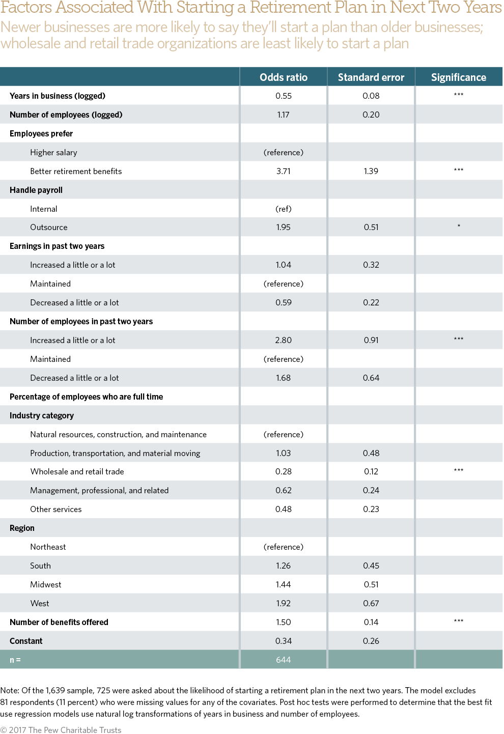 But many small and midsize employers appear eager to factor in their workers’ priorities as well. Those who say their employees prefer better retirement benefits over higher pay are more than three times as likely as those who say the reverse to respond that they intend to start a plan. (See Appendix Table 2 for regression results.)