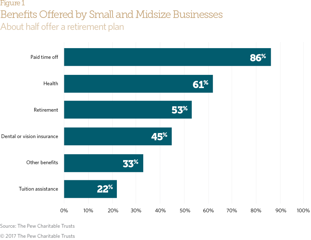 - Just over half of the small and midsize businesses surveyed offer a retirement plan; many are more likely to offer paid time off and health plans than retirement benefits.