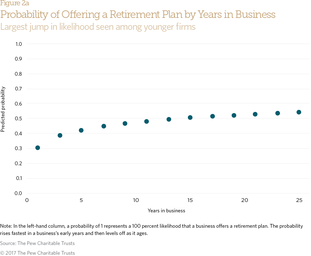 Meanwhile, a 3-year-old firm is 25 percent more likely to offer a retirement plan than a 1-year-old firm. That increase in probability diminishes as companies age. For example, one in business for 13 years is only 3 percent more likely than one in business for 11 years to offer one.