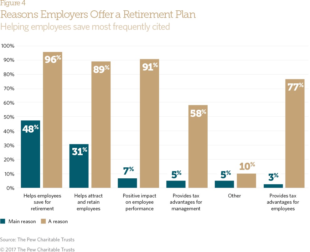 - Employers most often mention helping workers save for retirement and attracting and retaining employees as the main reasons they offer plans.