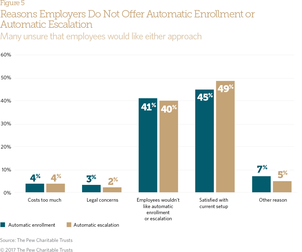 These findings show that despite the benefits of pro-savings tools, such as automatic enrollment or automatic escalation of contributions, many small employers lack the comfort level or knowledge to take advantage of such tools, or see cost, resources, or a lack of employee demand as reasons not to offer a retirement plan.