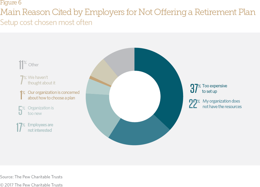 - Employers that do not offer plans pointed to the financial cost (37 percent) and organizational resources (22 percent) needed to start a plan as barriers. One-sixth said they do not offer a plan because their employees are uninterested.