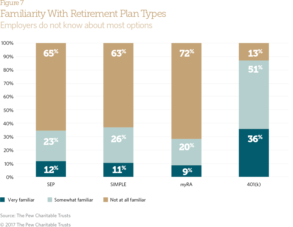 - A lack of employer familiarity with retirement plan options can be a barrier to sponsoring one. While most employers were at least somewhat familiar with 401(k) plans, far fewer knew about Simplified Employee Pension (SEP) plans, Savings Incentive Match Plan for Employees (SIMPLE) IRAs, or myRAs, all of which are designed for small firms or individuals.