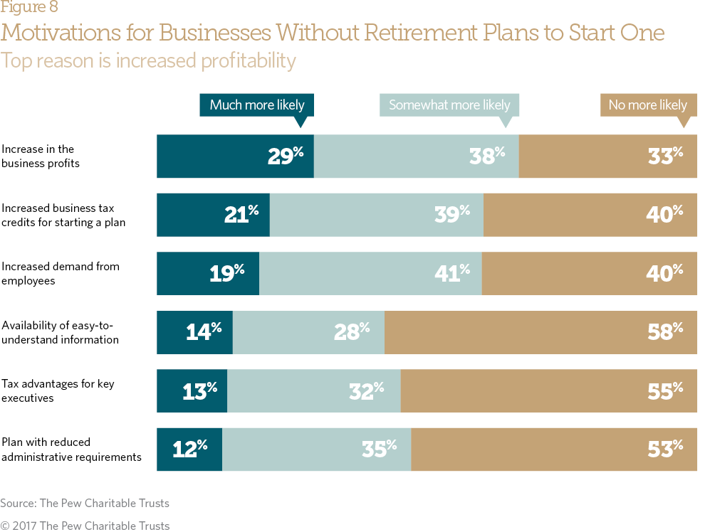 When businesses without a retirement plan were asked which circumstances were most likely to motivate them to begin one, the most common responses were a change in their financial situation or government incentives. Some 67 percent said increased business profits would make them somewhat or much more likely to start a retirement plan. Similarly, 60 percent said they would be somewhat or much more likely to start a plan if there were increased business tax credits for doing so. On the other hand, majorities said that availability of easy-to- understand information (58 percent), tax advantages for key executives (55 percent), or reduced administrative requirements (53 percent) would make them no more likely to offer plans.