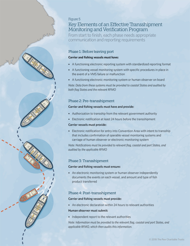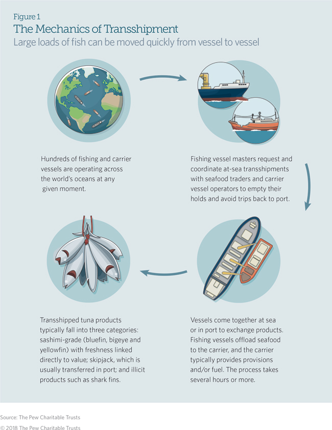 Transshipment is an important and growing part of the fishing industry, especially in the tuna fishery. However, without the proper regulations and reporting requirements in place, these activities can open the door to illegal fishing and the movement of illicitly caught products. Several States and RFMOs have begun to more closely manage transshipment, but global adoption of a full set of best practices is still needed to guarantee comprehensive compliance and data collection.