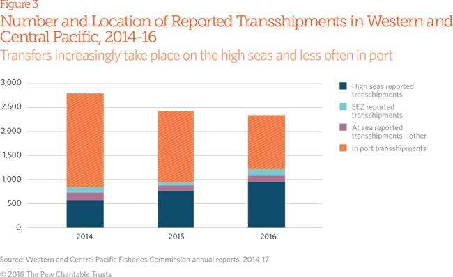 In 2017, for example, 52 percent of fishing vessels in the WCPFC were authorized to transship on the high seas. That was up slightly from 49 percent in 2016 but significantly more than the 40.5 percent in 2015.4