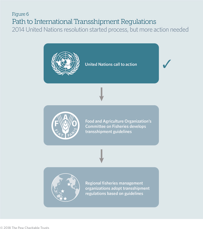 In recent years, the United Nations has focused on transshipment reform. The General Assembly’s 2014 Sustainable Fisheries Resolution urged States to work with RFMOs to develop and adopt effective monitoring, control and surveillance measures for transshipments.6