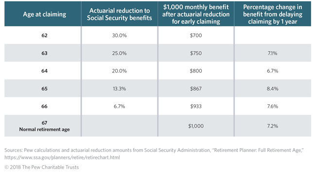 That means that a worker who claims Social Security benefits at age 62 would receive 30 percent less in the monthly benefit, as shown in Table 1, than would someone claiming at age 67: The worker who starts collecting at age 62 would receive $700 a month, compared with $1,000 for the worker who waits until age 67. Delaying payments for a single year increases payments by about 7 to 8 percent, depending on the claimant’s age.