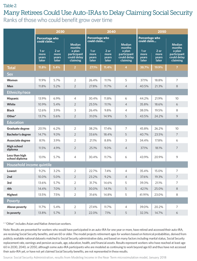 - The modeling shows that by 2050, after a hypothetical state-sponsored auto-IRA program has been in effect for 31 years, almost 40 percent of participants could delay claiming Social Security by a year or more. One- fifth of all savers could delay starting these payments for at least two years.
