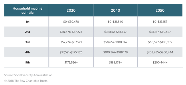 The Social Security Administration used its Modeling Income in the Near Term (MINT) microsimulation model to produce the data in this brief. In order to forecast retirement income, MINT projects work histories, mortality, marital status, and disability status for all individuals in the simulation on a national level. The SSA’s modeling for this project incorporates several assumptions. Specifically, in order to be eligible to participate in an auto-IRA plan, a worker must be over age 18, must work for an employer with 25 or more employees, and must not have access to a retirement savings plan or traditional pension through an employer. Workers are assumed to start participating in 2019. Rates of participation in auto-IRA plans are based on results of Pew’s survey of employees, “Worker Reactions to State-Sponsored Auto-IRA Programs.”14 Workers are assumed to access their accounts at retirement, which in the MINT model is interpreted as working less than 20 hours a week. Results are calculated on a national basis. Income quintiles are as follows (in real 2015 dollars):