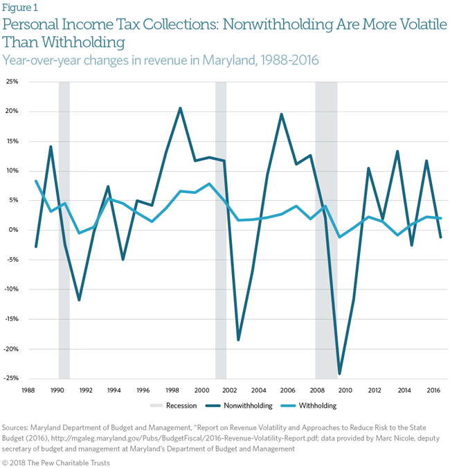 Income tax fluctuations can also create challenges for state officials tasked with forecasting revenue and making appropriations. While the nature of revenue forecasting means estimates will rarely be perfect, accurately predicting changes in revenue sources that swing more drastically is particularly difficult. Some states have responded by establishing policies to help limit the impact on budgets when tax collections miss the mark. Maryland and Virginia stand out with policies that aim to mitigate the uncertainty of nonwithholding income, the most volatile slice of their personal income tax collections.