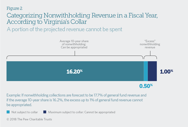 As a result of these analyses, Virginia leaders in 2016 decided to place restrictions on all nonwithholding income, rather than focusing on capital gains. They chose to put in place a budgetary “collar,” structured as an agreement between the Legislature and the office of Governor Terry McAuliffe (D). This rule restricts the estimated amount of nonwithholding income tax revenue the Legislature can appropriate when creating a new fiscal year budget. If nonwithholding collections are projected to exceed their 10-year average share but are less than 1 percent of total general fund revenue, they cannot be appropriated. Estimated revenue from this source that exceeds 1 percent is not subject to these restrictions.