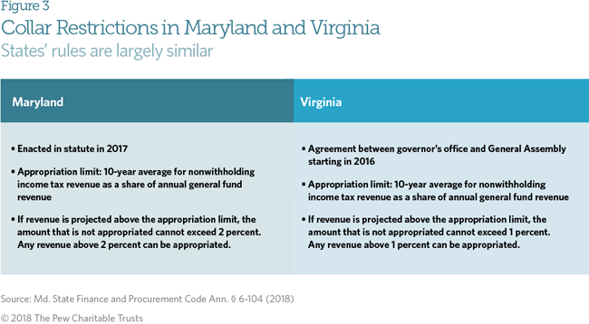 Maryland officials examined the approaches used in California and Massachusetts but ultimately adopted a rule similar to Virginia’s. Maryland and Virginia share important similarities, such as the lack of a separate capital gains tax rate or reporting structure. Unlike in Virginia, Maryland policymakers put the collar restriction into law, which was seen as making it more transparent and harder to circumvent.10 House Bill 503 was signed into law in July 2017, creating a restriction on appropriations from nonwithholding income tax revenue. The governor’s office and legislative leadership supported the measure, allowing it to pass the House and Senate unanimously.11