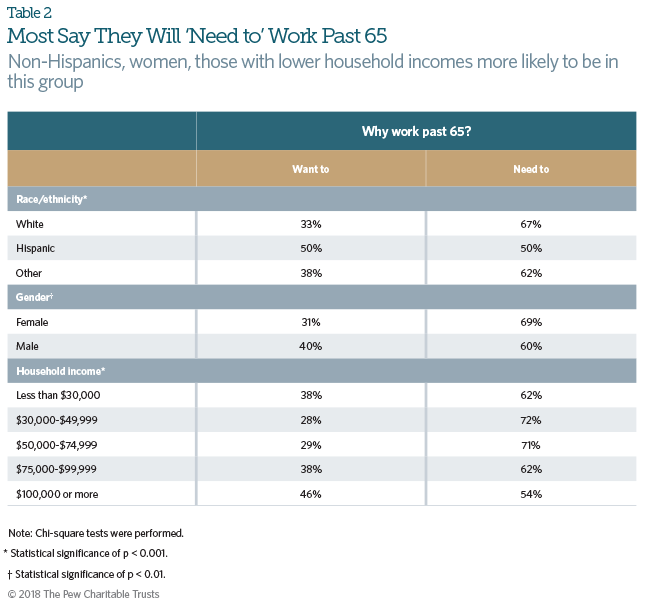 Are those who say they will work past age 65 doing so out of financial necessity or a desire to remain engaged? Pew’s survey results paint a mixed picture. Regardless of household income, workers were likely to say they would continue to work out of necessity. However, those in households earning $100,000 or more were the least likely to say so, illustrating not only the impact of earnings on the perceived need to continue working but the fact that high-paying jobs are potentially less physically demanding or allow for a more flexible schedule.