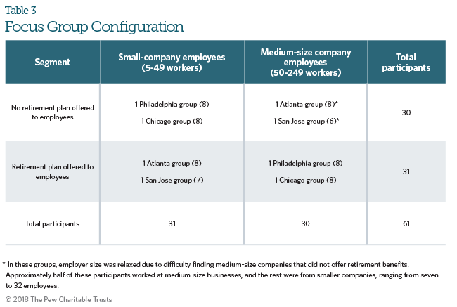 Pew also arranged eight focus groups in four major U.S. cities moderated by Alan Newman Research. In total, 61 employees from small businesses (5 to 49 employees) and medium-size businesses (50 to 249 employees) participated. The eight focus groups were divided by employer size and whether employees had access to an employer-sponsored retirement plan, as outlined in Table 3. Audio recordings were transcribed verbatim. Data were coded in NVivo by two Pew employees. Quotations presented in this brief were edited to remove fillers (e.g., “like,” “um”) and extraneous information, and for clarity.