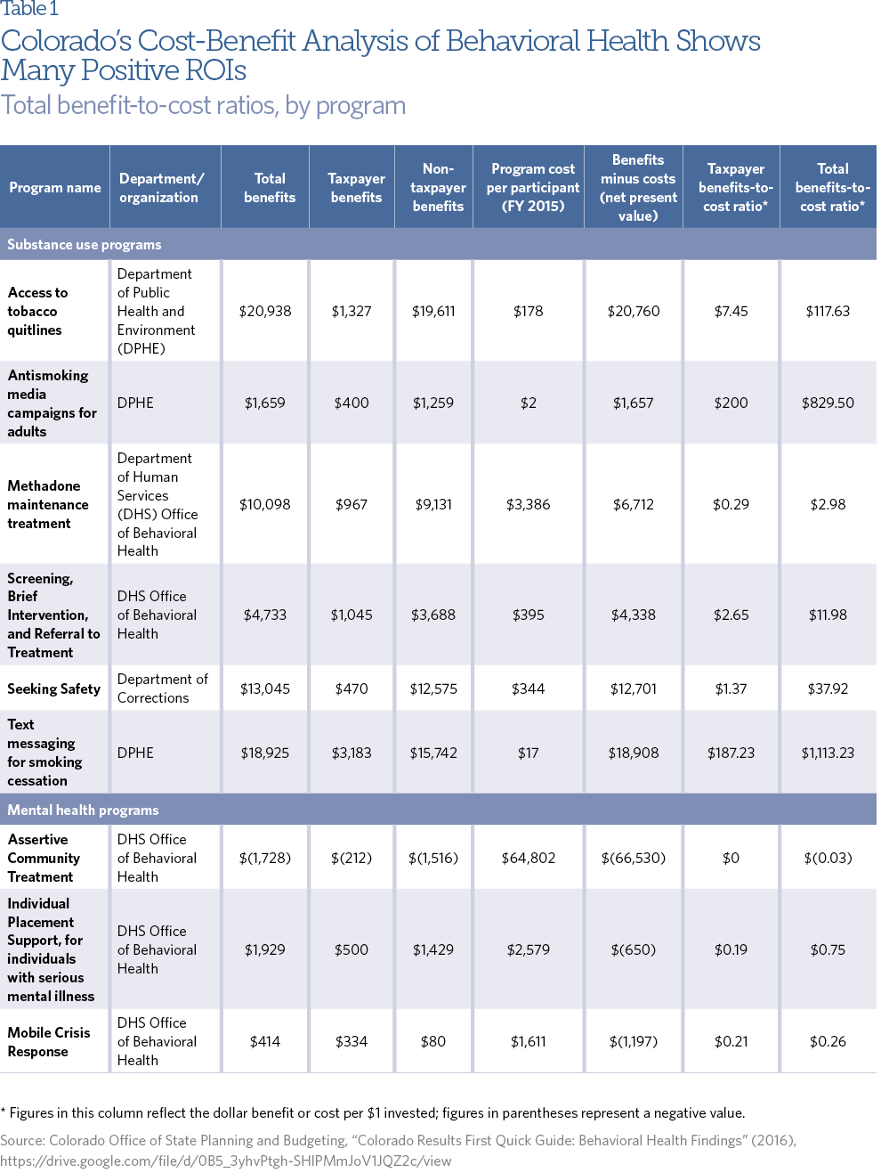 The behavioral health cost-benefit analysis that Colorado produced with the support of Results First provides an apples-to-apples comparison of similar programs within this policy area, although the programs listed may serve different populations, have different goals, and be delivered in different settings.