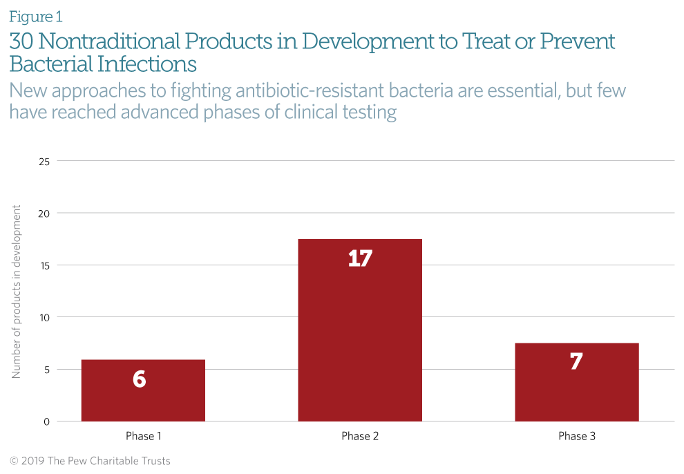 To shed light on the development of these types of products and evaluate public policies to spur innovation, The Pew Charitable Trusts assessed nontraditional products for the treatment of systemic bacterial infection in clinical testing. The list, which will be updated regularly, identifies each product and its manufacturer, type of approach, potential targets, and stage in the clinical development process. The list does not include products that are in development but not yet being tested in humans. (See the methodology below for the criteria used to select the nontraditional products.)