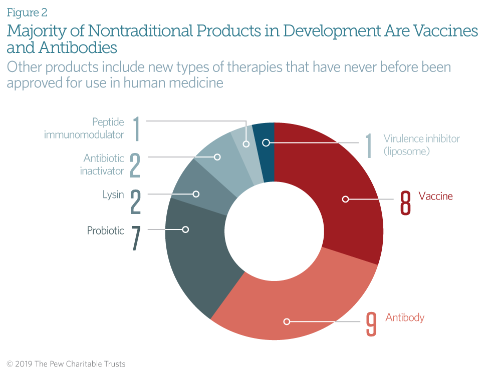 - More than half of the nontraditional products in development are vaccines or antibodies. The remaining candidates include lysins, probiotics, and peptide immunomodulators.