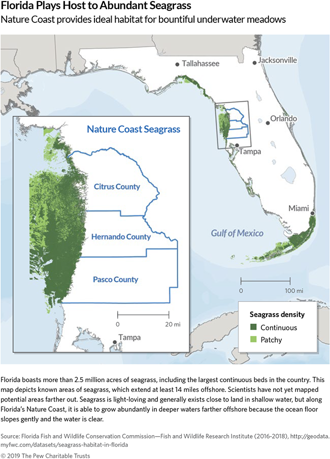 The approximately 400,000-acre habitat along the Nature Coast—which encompasses the shorelines of Citrus, Hernando, and Pasco counties bordering the Gulf of Mexico north of Tampa—is one of the healthiest seagrass habitats in the state.15 Here, seagrass mingles with mangrove islands, salt marsh, naturally occurring algae, sponges, and corals to provide habitat for recreationally and commercially important marine species that are the lifeblood of the region’s economy. The area is home to the “Manatee Capital of the World” and hosts world-class fishing and recreational opportunities that draw hundreds of thousands of tourists, support thousands of jobs, and generate millions of dollars annually.