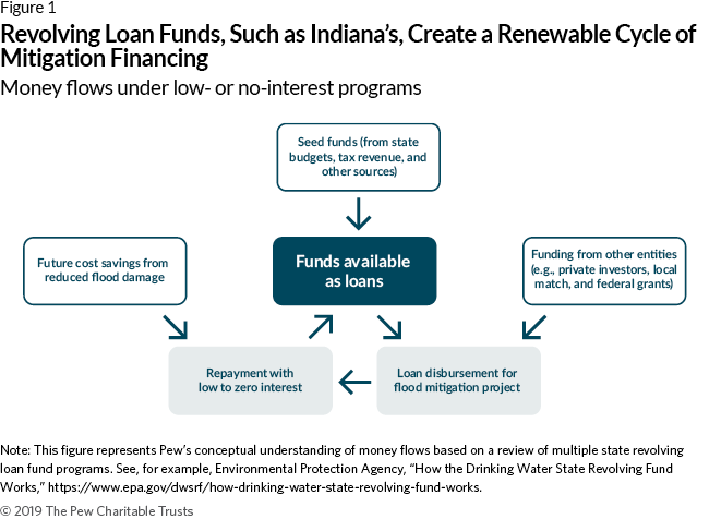 Indiana is subject to frequent riverine and flash floods. From Jan. 1, 2013, to Oct. 31, 2018, the state reported 987 flood events, with damage exceeding $10 million.1 Going further back, Indiana has endured a number of major floods, such as one in 2008 that caused over $1 billion in damage to the state.2 Motivated by the frequency of small floods, as well as the devastating impacts of major storms, Indiana officials in the 1950s adopted a Flood Control Revolving Fund to provide loans for projects that can mitigate the effects of flooding, and in 2016 state leaders made important improvements to the program. Indiana’s revolving fund is unique in that it operates entirely with state resources.
