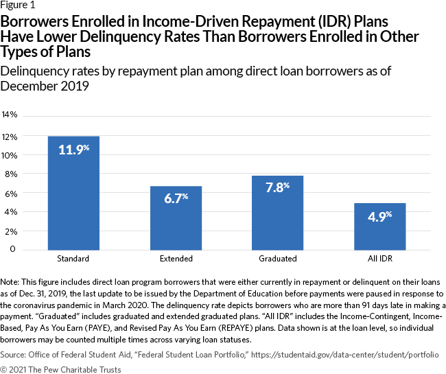 Congress has authorized, and the Department of Education offers, a range of options to help borrowers manage their monthly payments and avoid delinquency and default, including income-driven repayment plans that calculate monthly payments based on borrowers’ incomes and family sizes. However, a series of focus groups with student loan borrowers conducted by The Pew Charitable Trusts in 2018 and 2019 found that even when the economy is functioning well, the programs’ confusing enrollment and annual recertification processes can make it difficult for borrowers to take advantage of these choices.3 In addition, participants reported confusion about repayment requirements, unaffordable payments, inconsistent interactions with servicers, and growing loan balances, all of which caused frustration with and distrust of the repayment process. Although research indicates that some borrowers do not engage with the repayment system or can be difficult to reach, focus group participants who had made payments or interacted with their servicers said failures of the system chipped away at their resolve to repay, even when they were initially motivated to do so.4