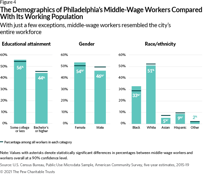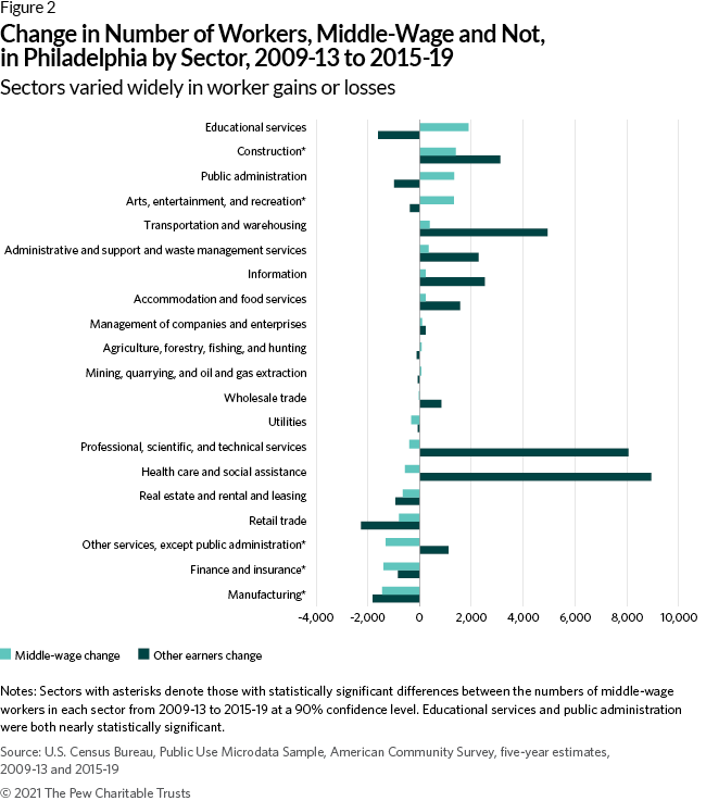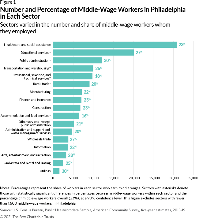 The Pew Charitable Trusts took an in-depth look at the nature of these jobs in Philadelphia before the COVID-19 pandemic, examining what pay levels constituted middle wages, which sectors have middle-wage positions, whether such jobs have become more or less numerous in recent years, and who holds these types of positions. The research was based primarily on the most recent census data available, which covers the five years from 2015 to 2019.