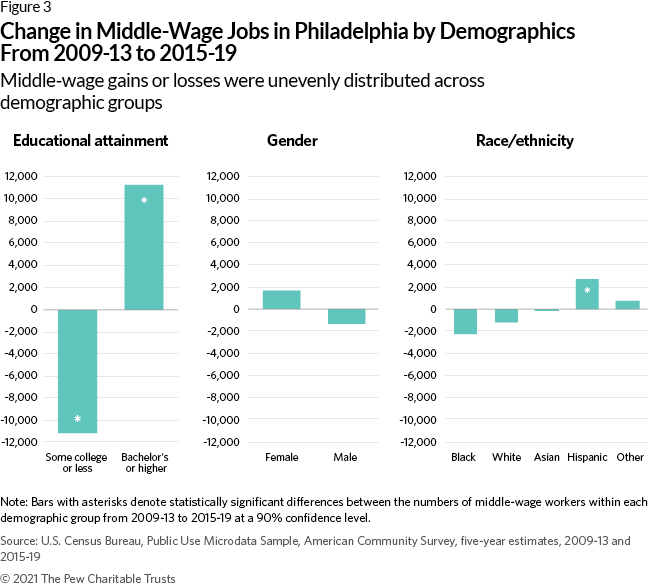 - This is consistent with a previous Pew study that looked at an eight-year period that included the 2007-09 recession and found that job gains for city residents came mostly from low-paying positions and, to a lesser extent, high-paying ones, with losses in the middle. See L. Eichel and S. Budick, “Philadelphia Job Growth Not Closing Wage Gap Between Residents and Suburban Commuters,” The Pew Charitable Trusts, Aug. 13, 2019, https://www.pewtrusts.org/en/research-and-analysis/articles/2019/08/13/philadelphiajob-growth-not-closing-wage-gap-between-residents-and-suburban-commuters. The median hourly wage in Philadelphia from 2009 to 2013 was $22.03 in 2019 dollars. Middle-wage earners during that period included those earning from $17.62 to $26.43 per hour and accounted for 24% of all workers.