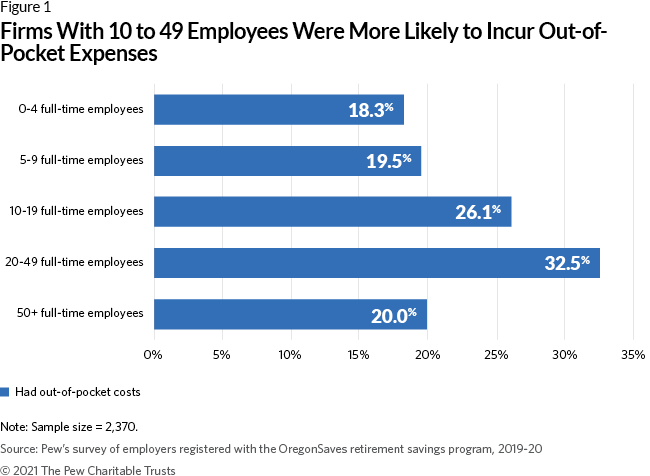Among those that reported having OOP costs, some said their external payroll processing firms had charged additional amounts to enroll workers or to process worker contributions. Other employers included as costs the uncompensated time they devoted to administrative tasks such as enrolling employees and processing contributions; consequently, the share of firms making cash outlays is likely lower than the overall figure of 21.5% reporting OOP costs. Firm size and industry type had a direct impact on the incurrence of OOP costs with OregonSaves.
