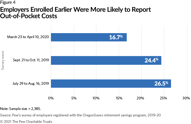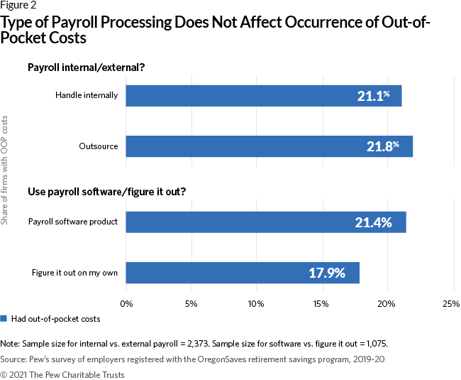 - The 21.5% of employers that did report OOP costs cited fees for outsourcing program contributions to external payroll firms or bookkeepers, wages for additional staff time to set up the program, and/or time spent registering employees with OregonSaves. Employers who handled payroll internally were about equally likely to report OOP costs as employers who outsourced their payroll management.