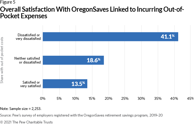 Overall satisfaction with OregonSaves was linked to whether or not the firm had OOP expenses (Figure 5), with just 13.5% of firms that identified as “satisfied” or “very satisfied” with the program also reporting OOP costs. By comparison, among firms that reported being “dissatisfied” or “very dissatisfied” with the OregonSaves, 41.1% reported having OOP costs.7