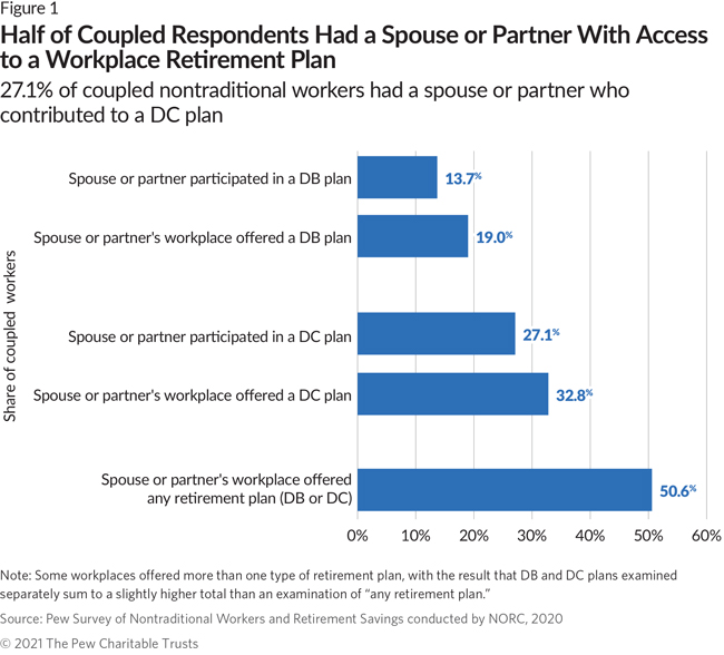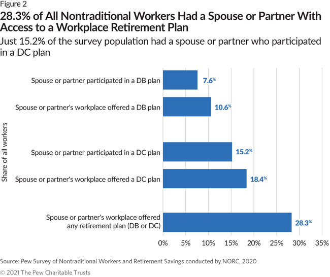 - Just 1 in 4 nontraditional workers had access to retirement benefits through a partner or spouse; 56% of nontraditional workers were married or living with a partner, and half of these coupled workers (50.6%) had a spouse or partner whose workplace offered a traditional defined benefit (DB), DC, or other type of retirement plan, such as an annuity.3