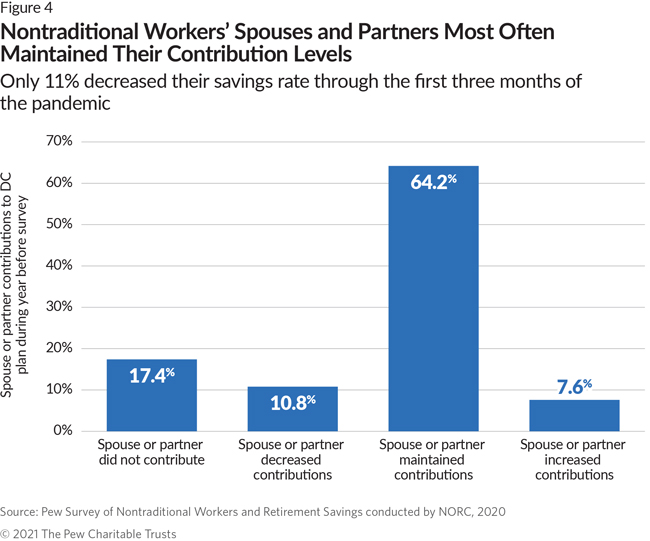 Pew’s survey asked respondents if their spouse or partner’s retirement plan contributions had increased, decreased, or stayed the same over the past 12 months.14 Because the survey question asked about contribution behavior over the past year, before the onset of the pandemic, we cannot say with certainty that any changes in contributions are due to the pandemic, but it is possible that the pandemic influenced some of the responses. The most common DC contribution pattern among spouses and partners of nontraditional workers was to maintain their existing contribution rate through the year before the survey, but 28.2% either reduced their contributions or did not contribute at all. (See Figure 4.) The high number of responses of maintaining or even increasing contributions suggests that many households may have weathered the economic downturn related to the pandemic well, at least in its early stages.