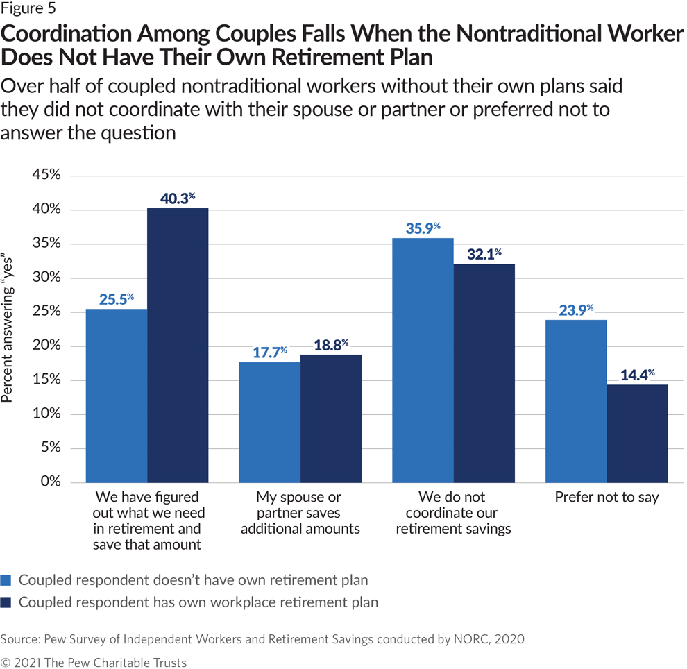 Couples in which one partner has access to a workplace plan may coordinate to save additional amounts. Unfortunately, the survey results suggest that less than half of coupled nontraditional workers are coordinating with their spouse or partner to save more or enough for a secure retirement.