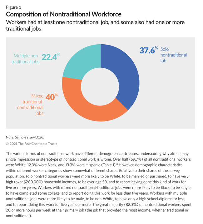 - Most nontraditional workers also hold other jobs, and some have access to a workplace plan through a second, traditional job. More than one-third (37.6%) of nontraditional workers held a single, nontraditional job. The other workers held multiple jobs5: 40% of nontraditional workers had a mix of traditional and nontraditional jobs, and the remaining quarter (22.4%) had two or three nontraditional jobs but no traditional job.