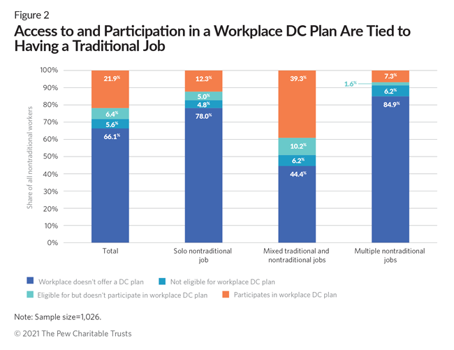 - Access to a plan was strongly tied to having at least one traditional job. Just 29.8% of nontraditional workers with no traditional job had access to a workplace retirement plan, but 69.7% of nontraditional workers with a traditional job had access.