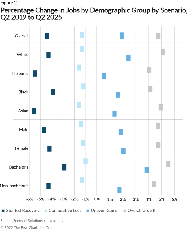 The Econsult analysis looked at how each scenario would affect job growth for White, Hispanic, Black, and Asian workers. Based on the share of jobs that the various groups held in each sector before the pandemic, the scenarios affect these demographic groups differently.