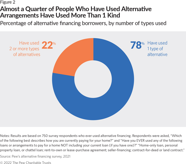 Among borrowers who have used alternative financing, 22% have used more than one of the arrangements that Pew studied. (See Figure 2.) And although the available evidence is insufficient to explain why borrowers use these alternatives, it does indicate that even financially capable borrowers face systemic barriers to accessing mortgages.