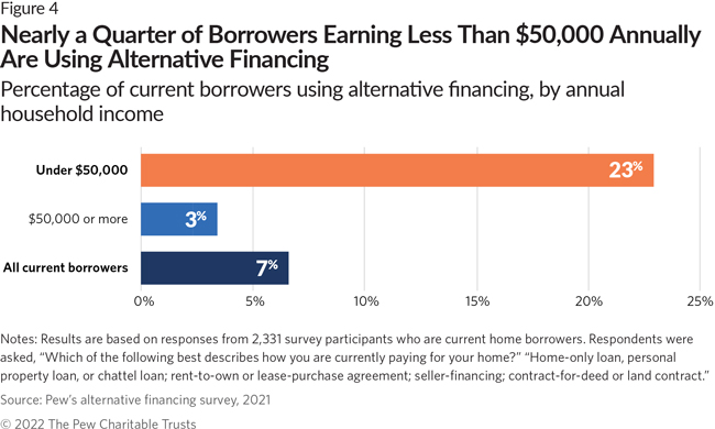 The survey found that lower-income borrowers are more likely than those with higher incomes to use alternative arrangements, making financially vulnerable families less likely to benefit from the consumer protections granted to federally regulated mortgages. Among all current borrowers, those with annual household incomes under $50,000 were more than seven times as likely to be using alternative financing instead of mortgages to buy their homes compared with individuals with annual household incomes above $50,000. (See Figure 4.)