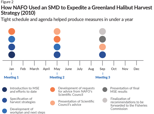 There are many ways to structure an SMD but, generally, holding multiple meetings provides a path to success because that allows ample opportunities for the group to meet its goals, from capacity building to the development of specified components of a harvest strategy. Convening regularly also helps the groups meet ambitious timelines without sacrificing stakeholder input and rigorous testing, reducing the likelihood that decision makers will be surprised by progress or results. As the above graphic shows, NAFO used multiple meetings of the WGMSE SMD—which set ambitious timelines and goals—to successfully develop a harvest strategy for Greenland halibut in less than a year. WGMSE prioritized capacity building in early sessions and then turned to more technical discussion and recommendations during the final meetings. NAFO’s dialogue groups set the standard for how to conduct these meetings and should be a model for other RFMOs structuring and scheduling their own dialogue groups.
