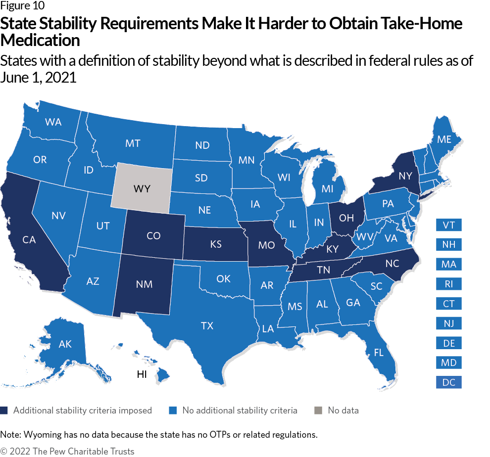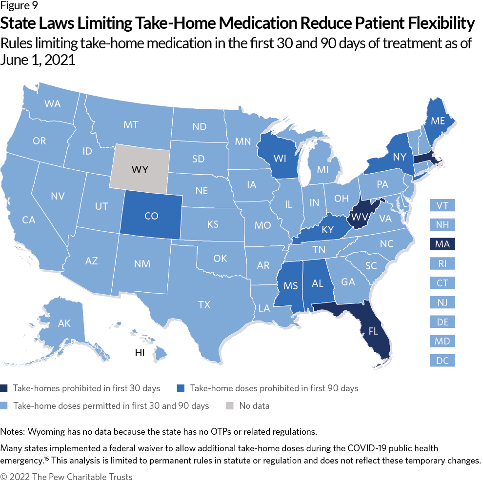 Ten states go beyond federal rules by prohibiting take-home doses in the first 30 days of treatment. Of these, seven states prohibit this practice during the full first 90 days of care.