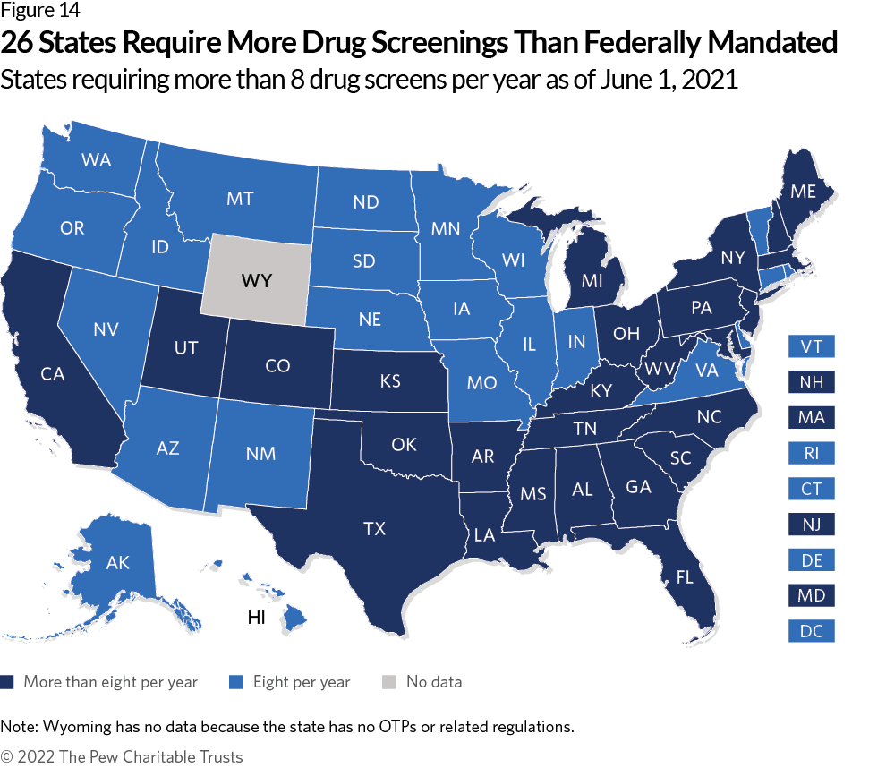 Federal rules require eight drug tests per year.29 Requiring additional tests places a burden on patients and, according to preliminary research, may not be as necessary for patient safety as once thought, and may also raise the cost of treatment.30