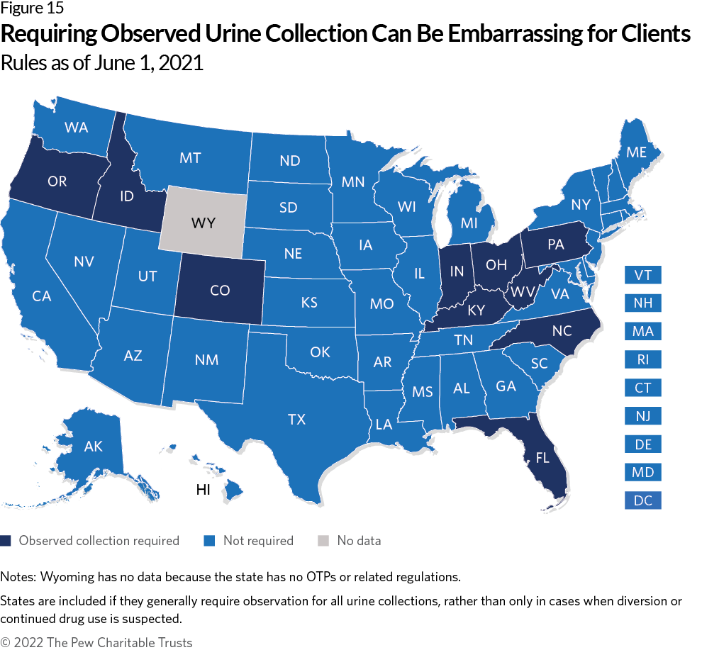 Ten states have rules requiring OTPs to observe patients during urine sample collection, which can be embarrassing and degrading for clients.31 According to one, “I don’t like somebody looking at me, or behind me … it’s not a very pleasant experience for anybody. Actually, I think it’s undignified, and I feel it’s wrong.”32