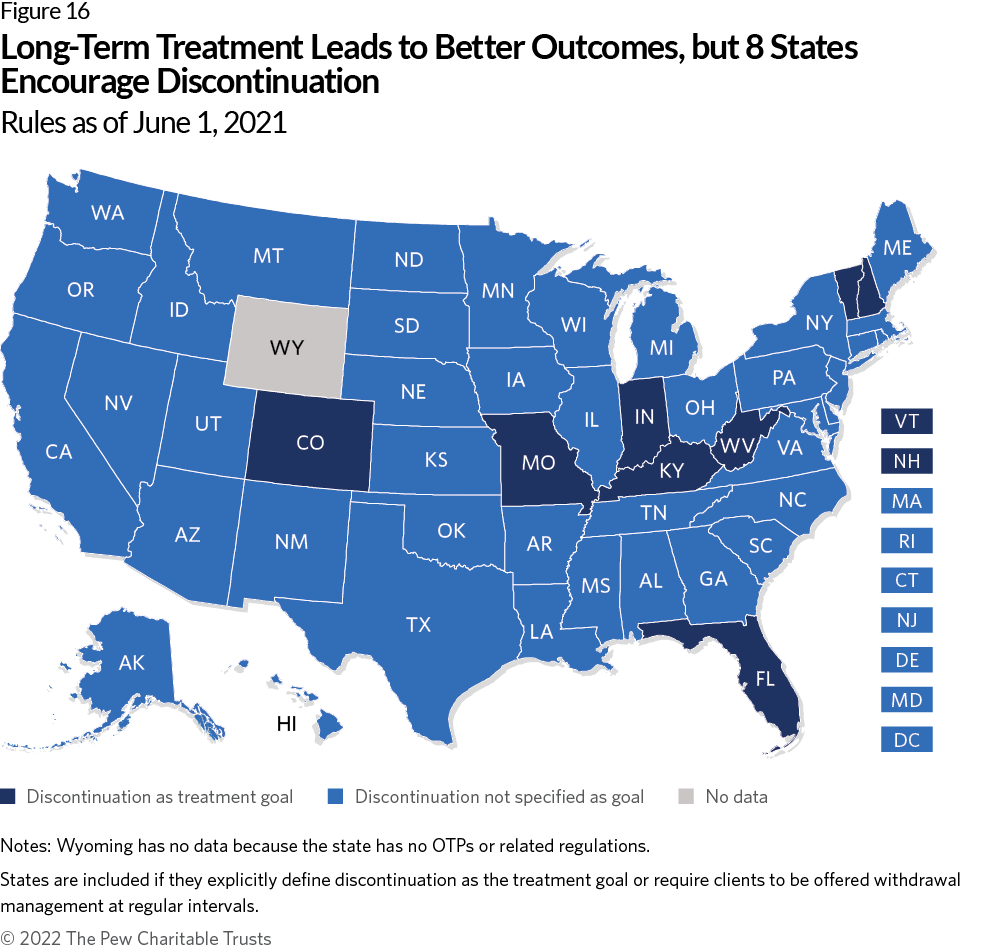 But eight states have rules that establish discontinuation as the goal of treatment. These regulations may encourage providers and patients to stop treatment when doing so is not necessary and can increase overdose death.34
